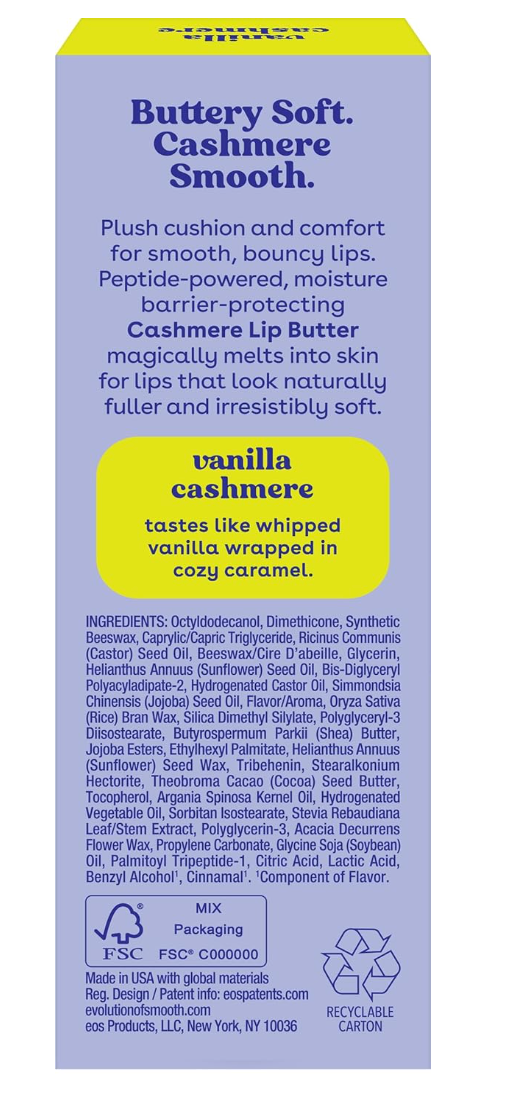 EOS Cashmere Lip Butter, Vanilla Cashmere, Plumping Peptides, 0.35 fl oz, Smooth Lips